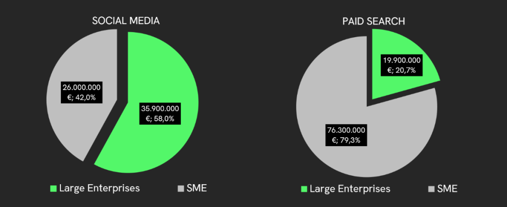 U strukturi ukupne potrošnje, velike kompanije koje u pravilu uslugu oglašavanja prepuštaju specijaliziranim medijskim agencijama uložile su ukupno 120 milijuna Eura u 2022. godini. U dijelu potrošnje koji se odnosi na SME segment, važno je napomenuti sve brže rastuće oglašivačke aktivnosti stranih e-commerce kompanija.